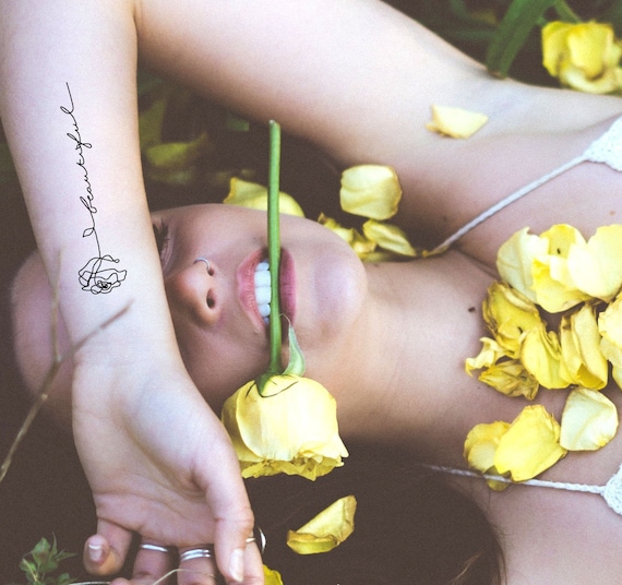 2 Rose Beautiful Temporary Tattoos Flower Stem Word Temporary Tattoo Calligraphied Tattoo Single Line Tattoo