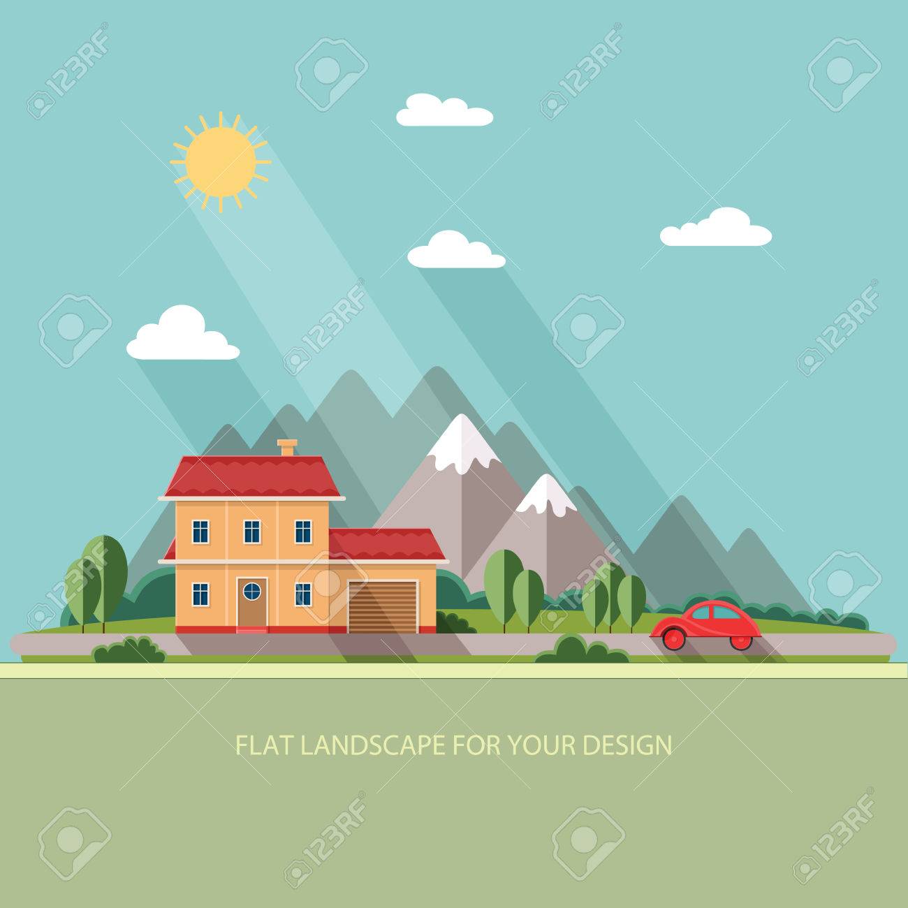Red Car Vacation Home On A Background Mountains Flat Design Stock